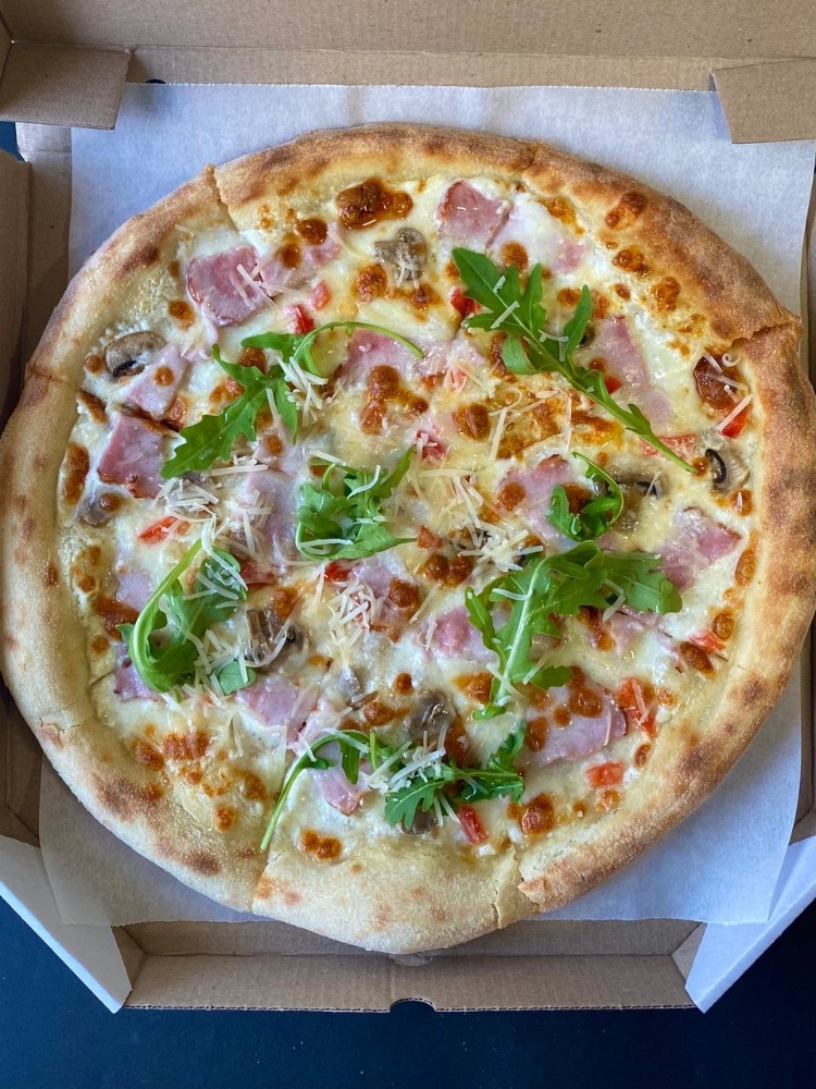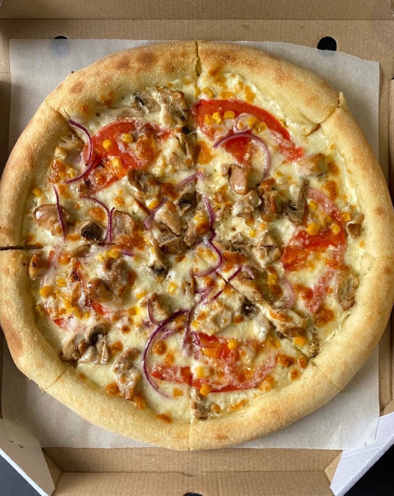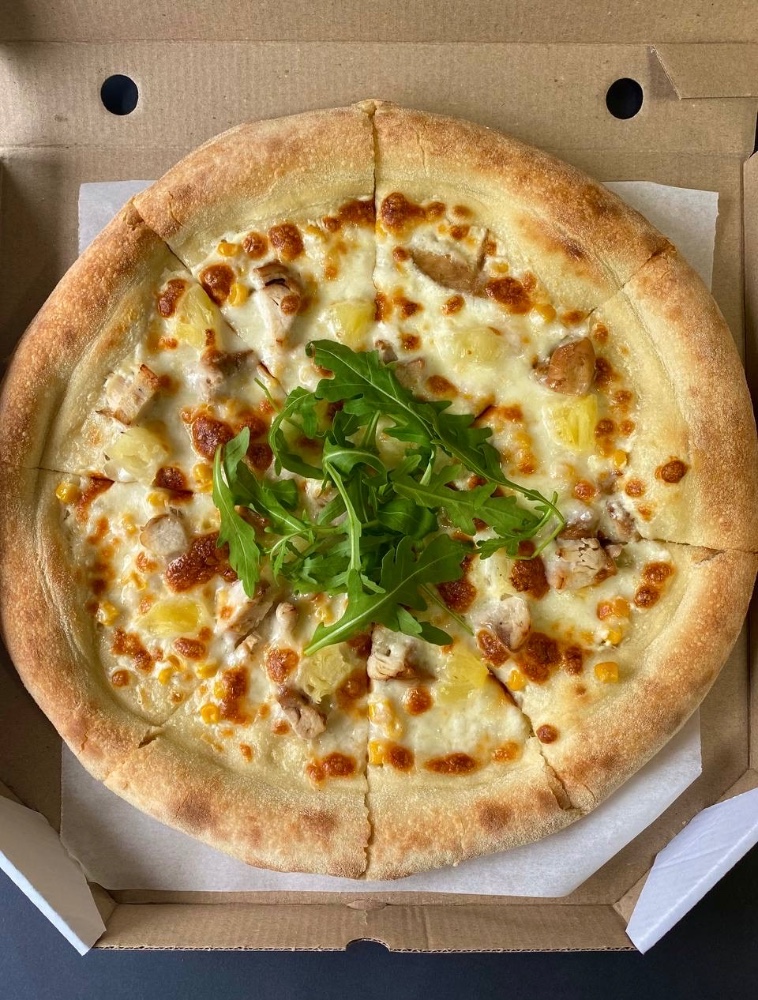 Склад:Лаваш,курка,салат айсберг,помідори,ананас,кукурудза,шампіньйони смажені ,сир,соус вершковий .