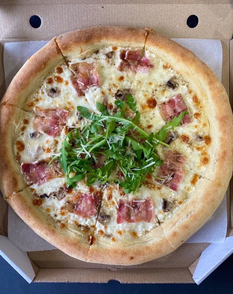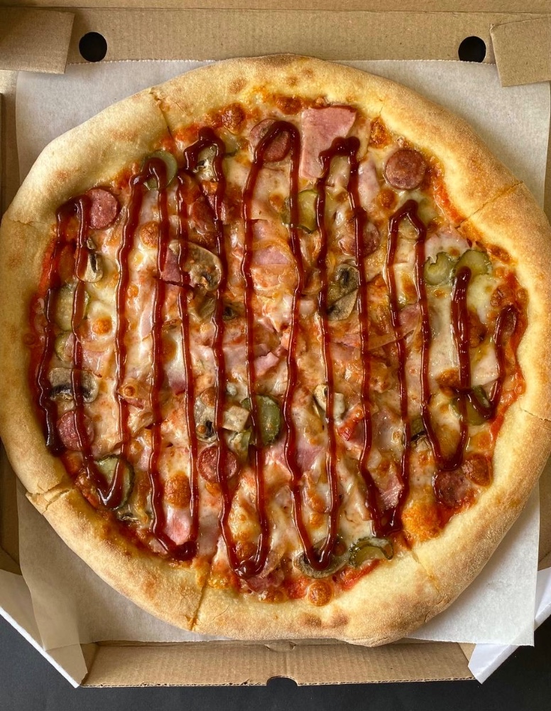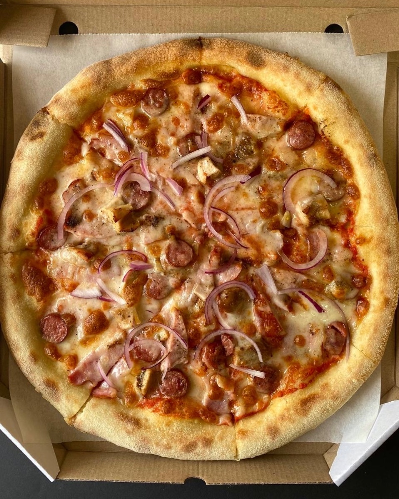 Склад:Котлета з курки подвійна ,булочкабріош ,бекон,сир чеддер Помідори,салат айсбергКримська цибуля Соус кетченез з маринованим огірком (власного виробництва)