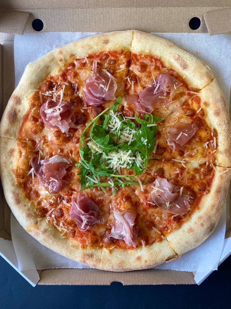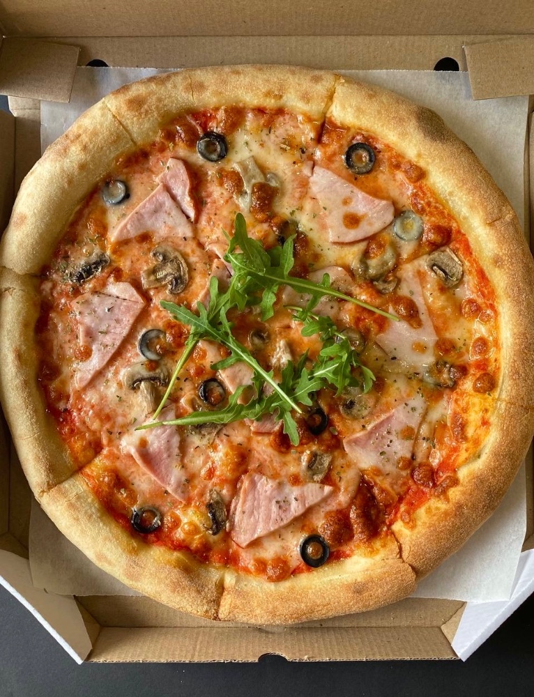 Склад:Котлета з телятини булочка бріош ,бекон,пармезанПомідори,салат айсбергСир чеддер,яйце смажене Карамелізована цибуля Соус кетченез з маринованим огірком (власного виробництва)