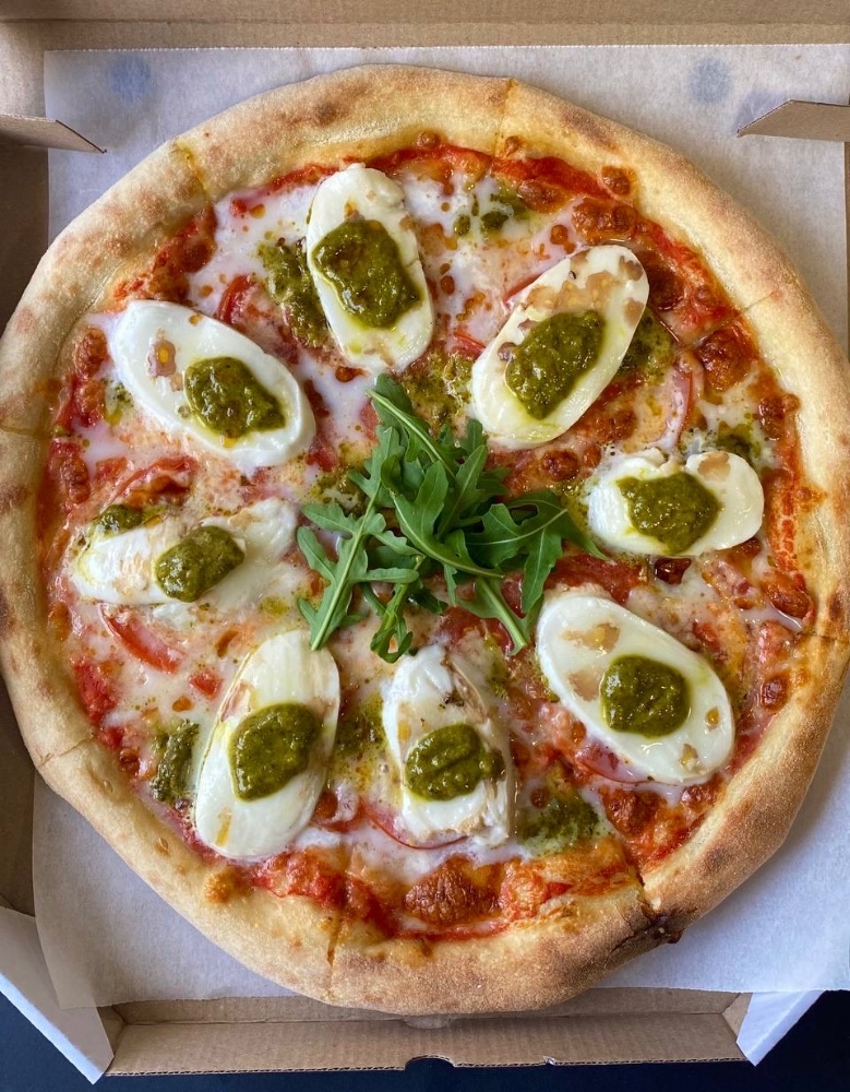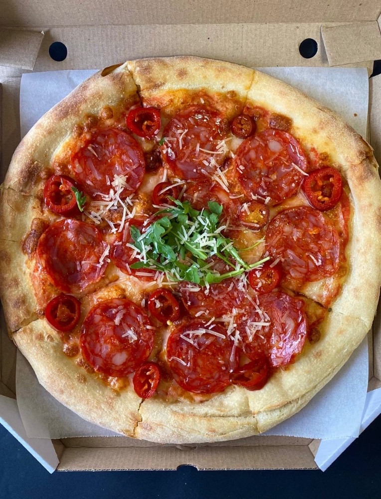Склад:Котлета з телятини,булочка бріош ,бекон,гострий перець Помідори,салат айсбергСир чеддер,кримська цибуля Вершковий гострий соус Соус кетченез з маринованим огірком (власного виробництва)