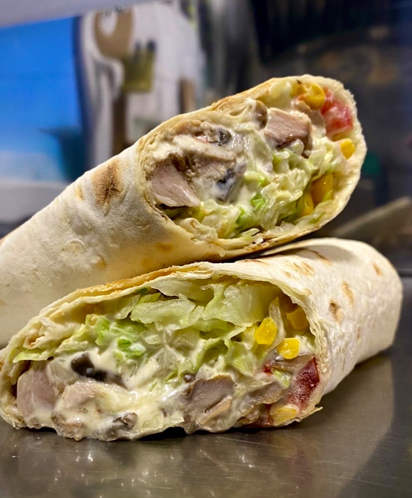 Склад:Сир сулугуні лаваш ,курка смаженакінза,петрушка,помідори,перець солодкий,фірмовий соус ( власного виробництва)